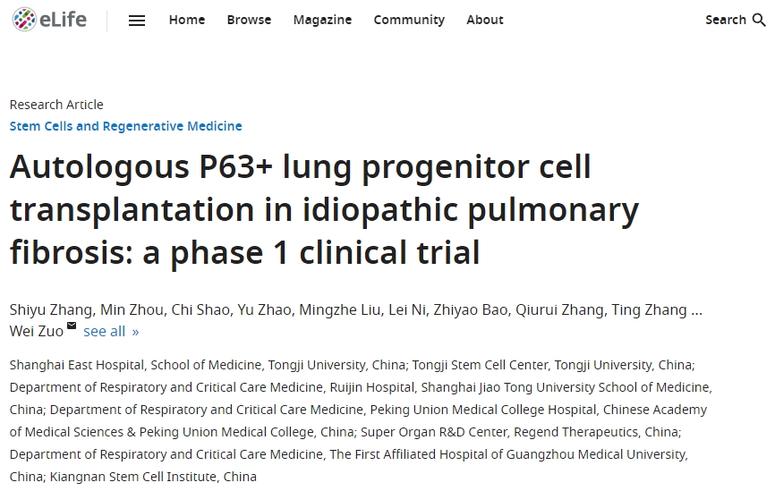 近期,以中國(guó)同濟(jì)大學(xué)醫(yī)學(xué)院上海市東方醫(yī)院(以下簡(jiǎn)稱我們)為牽頭的機(jī)構(gòu)進(jìn)行了一項(xiàng)自體P63+肺祖細(xì)胞移植治療特發(fā)性肺纖維化:1期臨床試驗(yàn)。該臨床試驗(yàn)結(jié)果發(fā)表在期刊雜志《Stem Cells and Regenerative Medicine》上[1]。