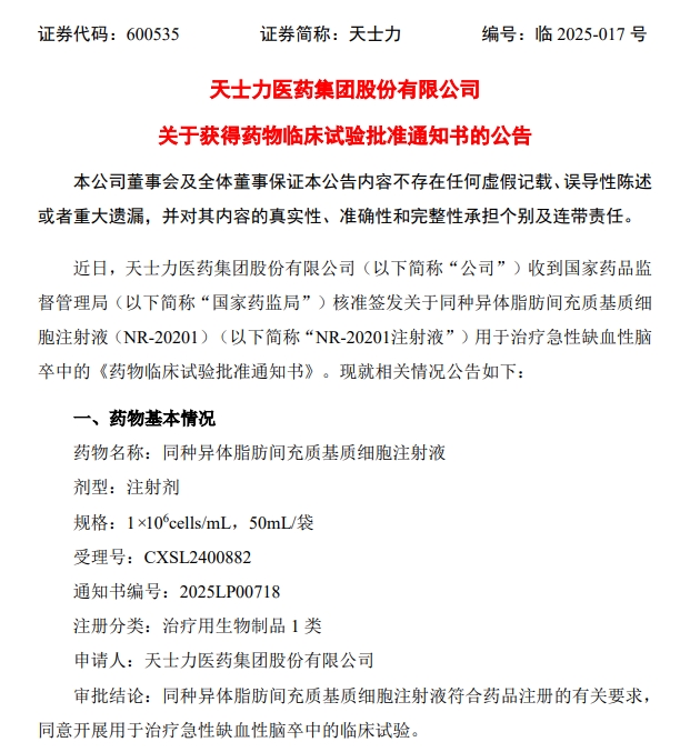 該藥物由天士力醫藥集團自主研發,擬用于治療急性缺血性腦卒中。此次批準標志著中國在細胞治療領域實現重大突破,成為全球少數完成此類藥物監管審評的國家之一。