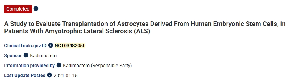 人胚胎干細胞治療漸凍癥的I/IIa期臨床試驗(NCT03482050)