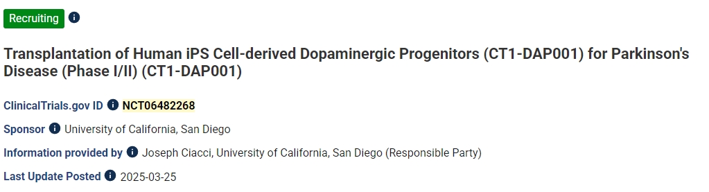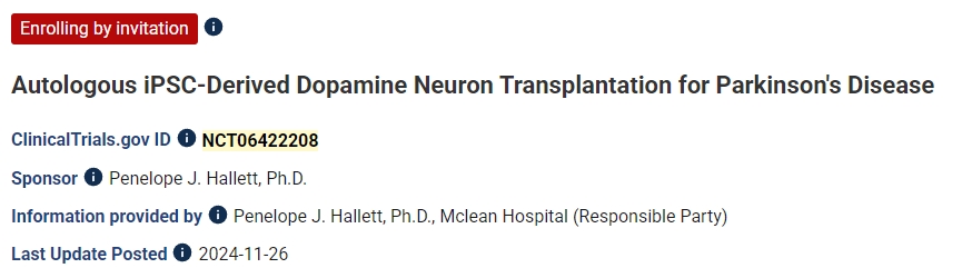 該項1期臨床試驗 (NCT06422208) 針對6名接受自體iPSC衍生多巴胺神經元移植治療帕金森病的患者,該試驗基于Penelope J. Hallett博士的工作。