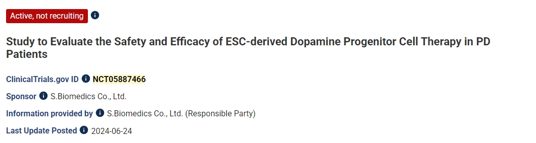 該項臨床試驗(NCT05887466)是一項開放標簽、單中心、單劑量、劑量遞增、I/IIa期試驗,旨在評估胚胎干細胞衍生的A9多巴胺祖細胞(A9-DPC)治療PD患者的安全性和探索性療效,該試驗由S.Biomedics贊助。這項研究基于Dong-Wook實驗室進行的臨床前工作。