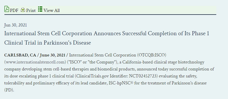 2021年6月30日,一家總部位于加利福尼亞州的臨床階段生物技術公司,致力于開發基于干細胞的療法和生物醫學產品,宣布成功完成其劑量遞增1期臨床試驗(ClinicalTrials.gov標識符:NCT02452723),試驗對象為12名患者。評估其主要候選藥物ISC-hpNSC?用于治療帕金森病 (PD) 的安全性、耐受性和初步療效。