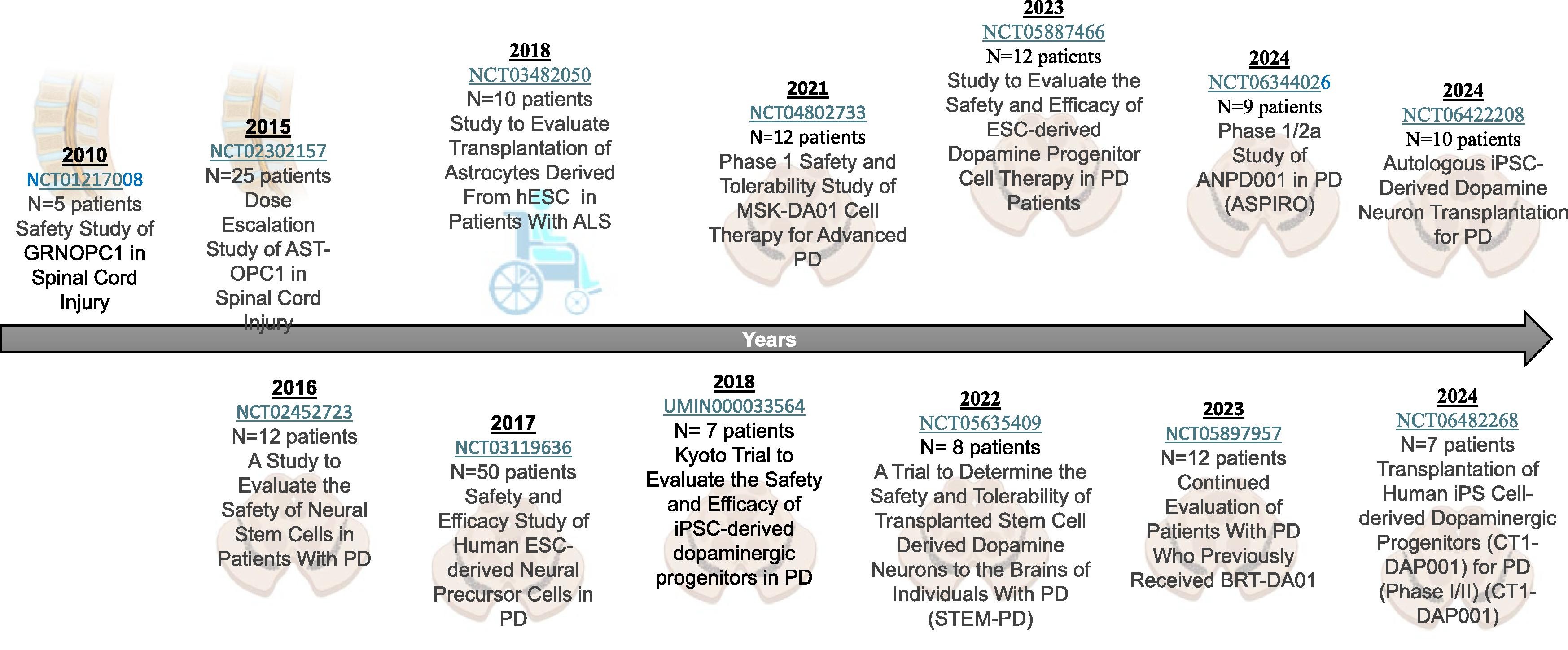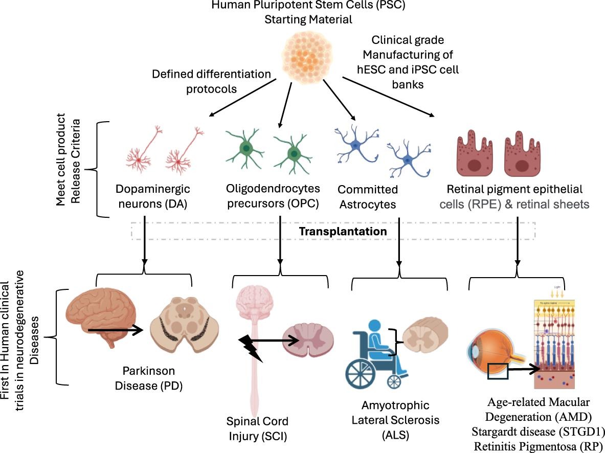 在過去二十年中,全面的臨床前有效性(概念驗證)和安全性研究推動了多能干細胞針對多種神經退行性疾病的首次人體I-II期臨床試驗的啟動。