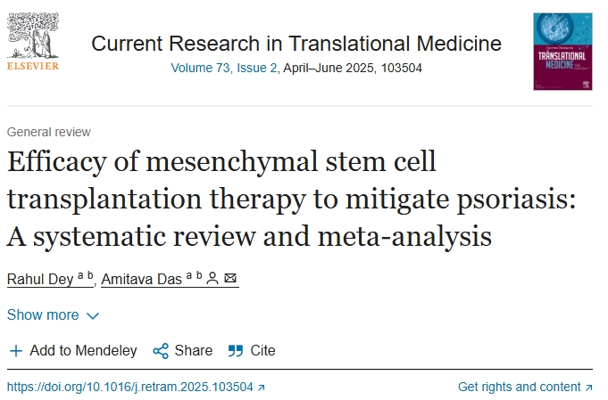 近期,國際期刊Current Research in Translational Medicine發(fā)表題為’Efficacy of mesenchymal stem cell transplantation in alleviating psoriasis: a systematic review and meta-analysis’的綜述[1]。