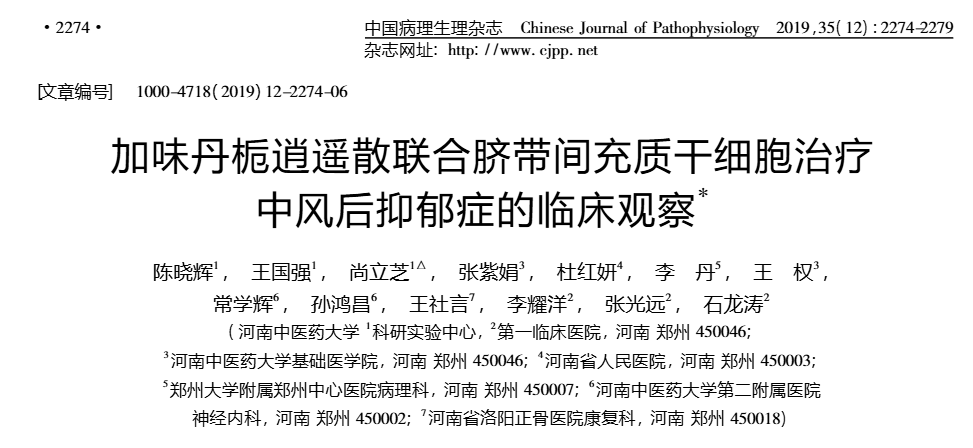 2019年12月15日,河南中醫藥大學科研實驗中心在《中國病理生理雜志》上發表了一篇關于《加味丹梔逍遙散聯合臍帶間充質干細胞治療中風后抑郁癥的臨床觀察》的研究結果。【2】
