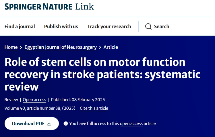 近日,國(guó)際期刊雜志《?Egyptian Journal of Neurosurgery》發(fā)表了一篇“Role of stem cells on motor function recovery in stroke patients: systematic review”的臨床研究綜述,該綜述旨在進(jìn)行全面的系統(tǒng)評(píng)價(jià)和薈萃分析,以評(píng)估皮下注射對(duì)中風(fēng)運(yùn)動(dòng)恢復(fù)的治療潛力。