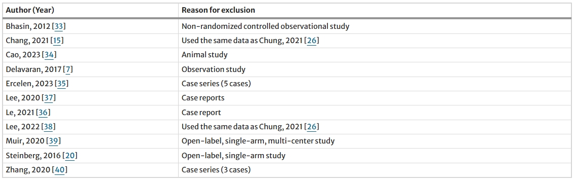 納入研究的特征和質(zhì)量評(píng)估分別詳見(jiàn)表2和表3。共納入190例患者,其中治療組115例,對(duì)照組75例。治療方式包括自體間充質(zhì)干細(xì)胞(n=2)和 G-CSF(n?=2)刺激以增加干細(xì)胞。綜述中納入的文章來(lái)自韓國(guó)、法國(guó)、英國(guó)和臺(tái)灣。所有研究的平均年齡為63.15歲,范圍從53歲到76歲。