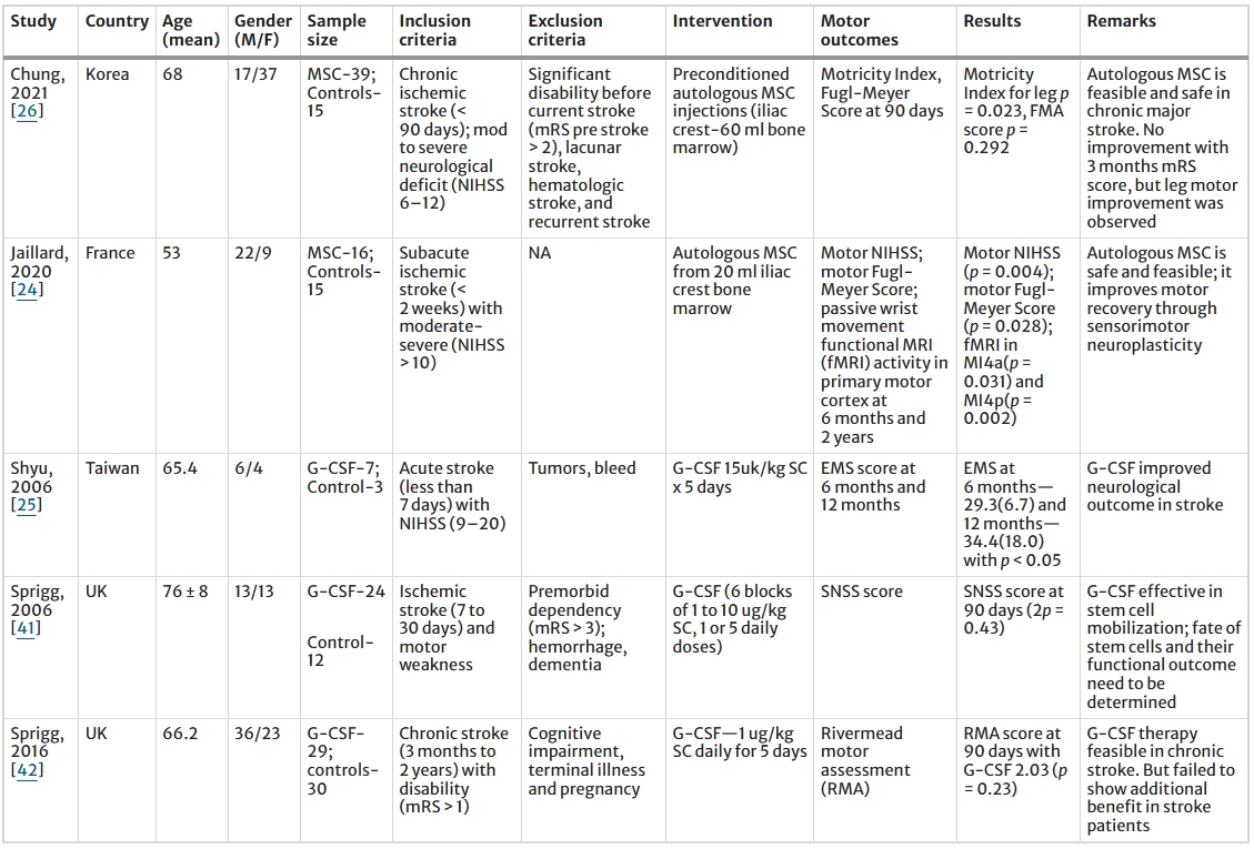 美國(guó)國(guó)立衛(wèi)生研究院卒中量表 (NIHSS) 被用作殘疾的納入標(biāo)準(zhǔn)(n=3),兩項(xiàng)研究使用了改良Rankin量表 (mRS)。這些研究的共同排除標(biāo)準(zhǔn)包括出血性卒中(n?=4)和其他醫(yī)學(xué)合并癥。兩項(xiàng)研究中的間充質(zhì)干細(xì)胞 (MSC) 均從髂嵴中提取。一項(xiàng)研究以1×106kg的劑量注射MSC,而另一項(xiàng)研究則通過(guò)靜脈注射了1億至3億個(gè)MSC。三項(xiàng)研究均采用皮下注射粒細(xì)胞集落刺激因子(G-CSF),其中一項(xiàng)研究的劑量為1μg/kg,持續(xù)5天,另一項(xiàng)研究的劑量為15μg/kg,持續(xù)5天,還有一項(xiàng)研究的劑量為增量注射。