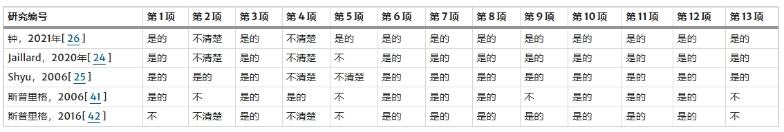 結(jié)果:采用上述檢索策略,我們共檢索到739篇文章。刪除280條重復(fù)記錄后,剩余459篇文章。進(jìn)一步篩選后,共排除443篇文章。隨后,對(duì)16篇文章進(jìn)行了全文檢索,其中排除11篇,排除原因詳見(jiàn)表1。此外,通過(guò)對(duì)已納入的5篇文章進(jìn)行引文檢索,又找到1篇文章,最終共計(jì)6篇文章可供定性綜合。
