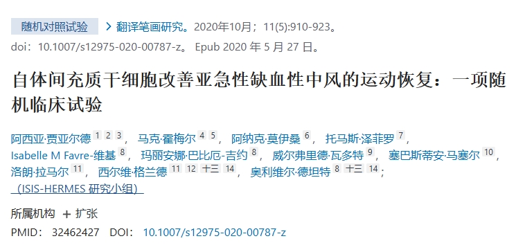 臨床案例一:2021年,期刊雜志《神經(jīng)病學(xué)》發(fā)表了一篇“靜脈間充質(zhì)干細(xì)胞治療缺血性卒中的療效和安全性”臨床研究文章。