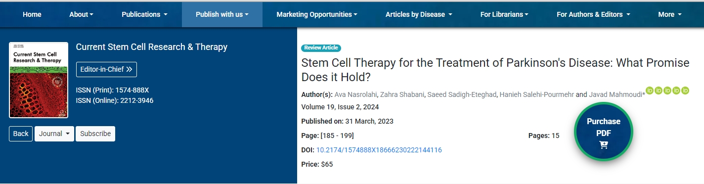 近日,國際期刊雜志《Current Stem Cell Research & Therapy》發表了一篇“Stem Cell Therapy for the Treatment of Parkinson’s Disease: What Promise Does it Hold?”的文章。