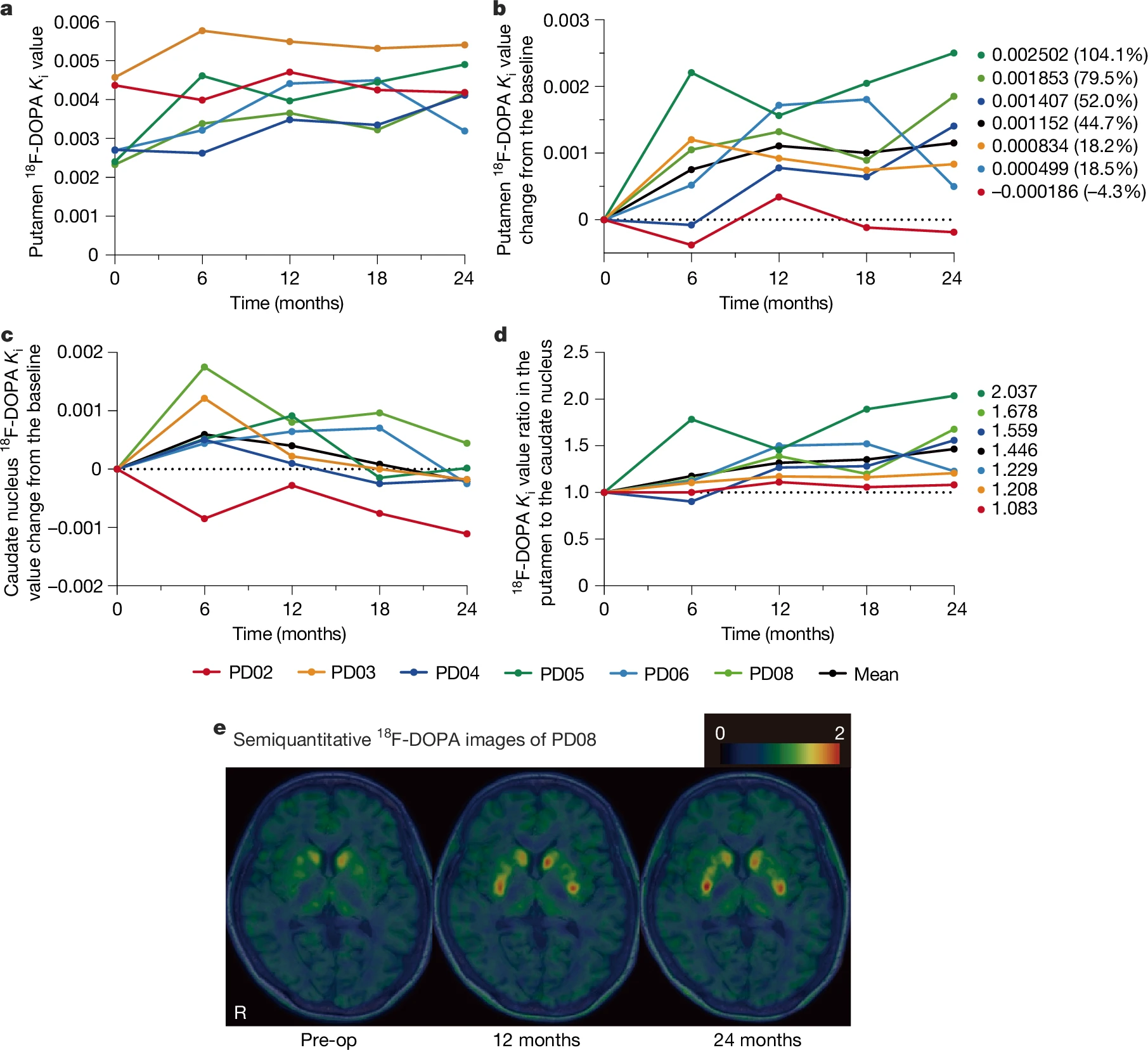 療效方面,6名患者中4例在移植后24個月停藥期運動功能改善(MDS-UPDRS III OFF 評分平均下降20.4%),殼核區(qū)18F-DOPA攝取量顯著增加(總平均+44.7%),表明移植細(xì)胞可功能性替代丟失的 DA 神經(jīng)元,恢復(fù)局部多巴胺合成能力。