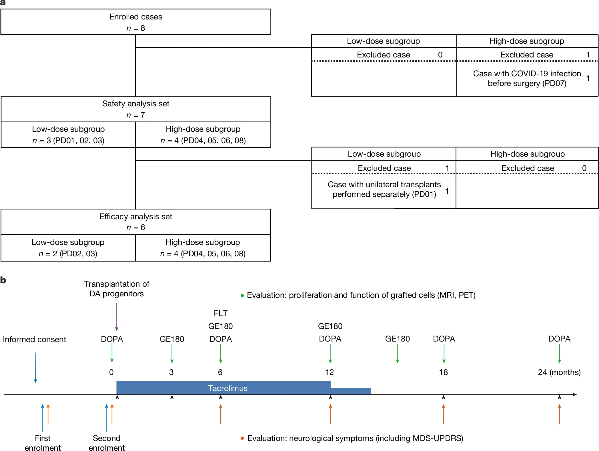 我們之前開發(fā)了一種從人類誘導(dǎo)多能干細(xì)胞中誘導(dǎo)DA神經(jīng)元并分選DA祖細(xì)胞的方法。這些細(xì)胞在非人類靈長類帕金森病模型的大腦中產(chǎn)生了DA,并改善了它們的運動癥狀。在臨床前研究證實了其在致瘤性、毒性和生物分布方面的安全性后,我們獲得了日本政府和京都大學(xué)機構(gòu)審查委員會的批準(zhǔn)。在此,我們報告了2018年啟動的臨床試驗的結(jié)果。