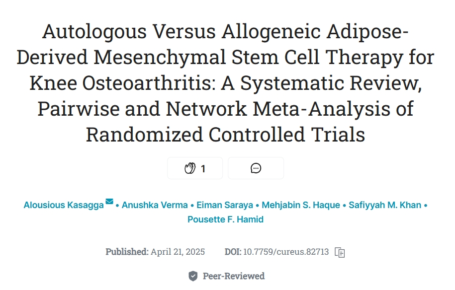 參考資料:Kasagga A, Verma A, Saraya E, et al. (April 21, 2025) Autologous Versus Allogeneic Adipose-Derived Mesenchymal Stem Cell Therapy for Knee Osteoarthritis: A Systematic Review, Pairwise and Network Meta-Analysis of Randomized Controlled Trials. Cureus 17(4): e82713. doi:10.7759/cureus.82713