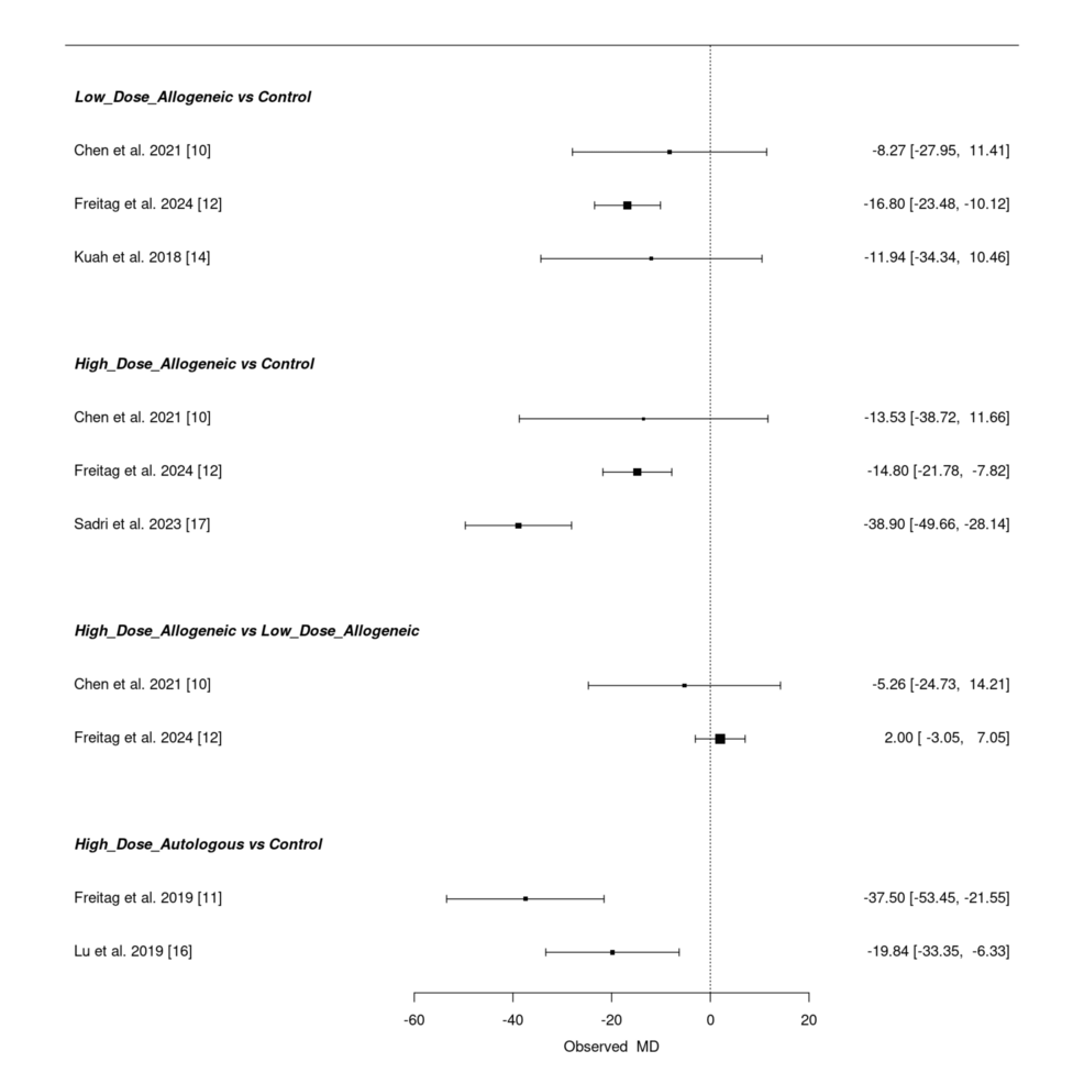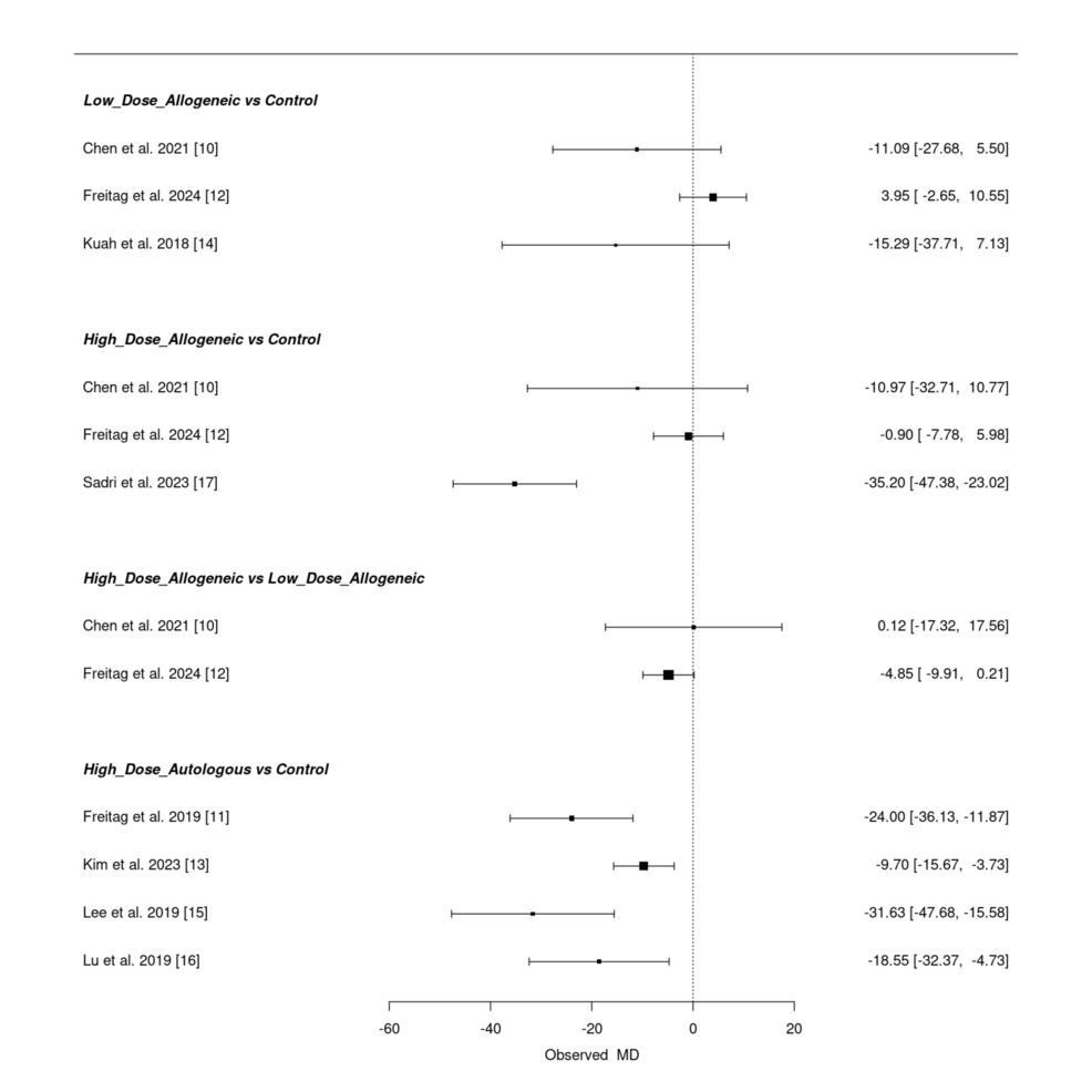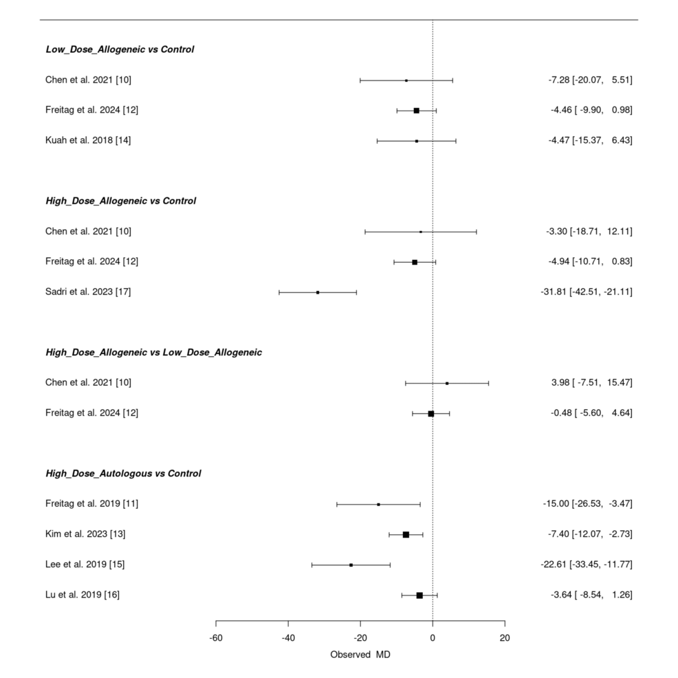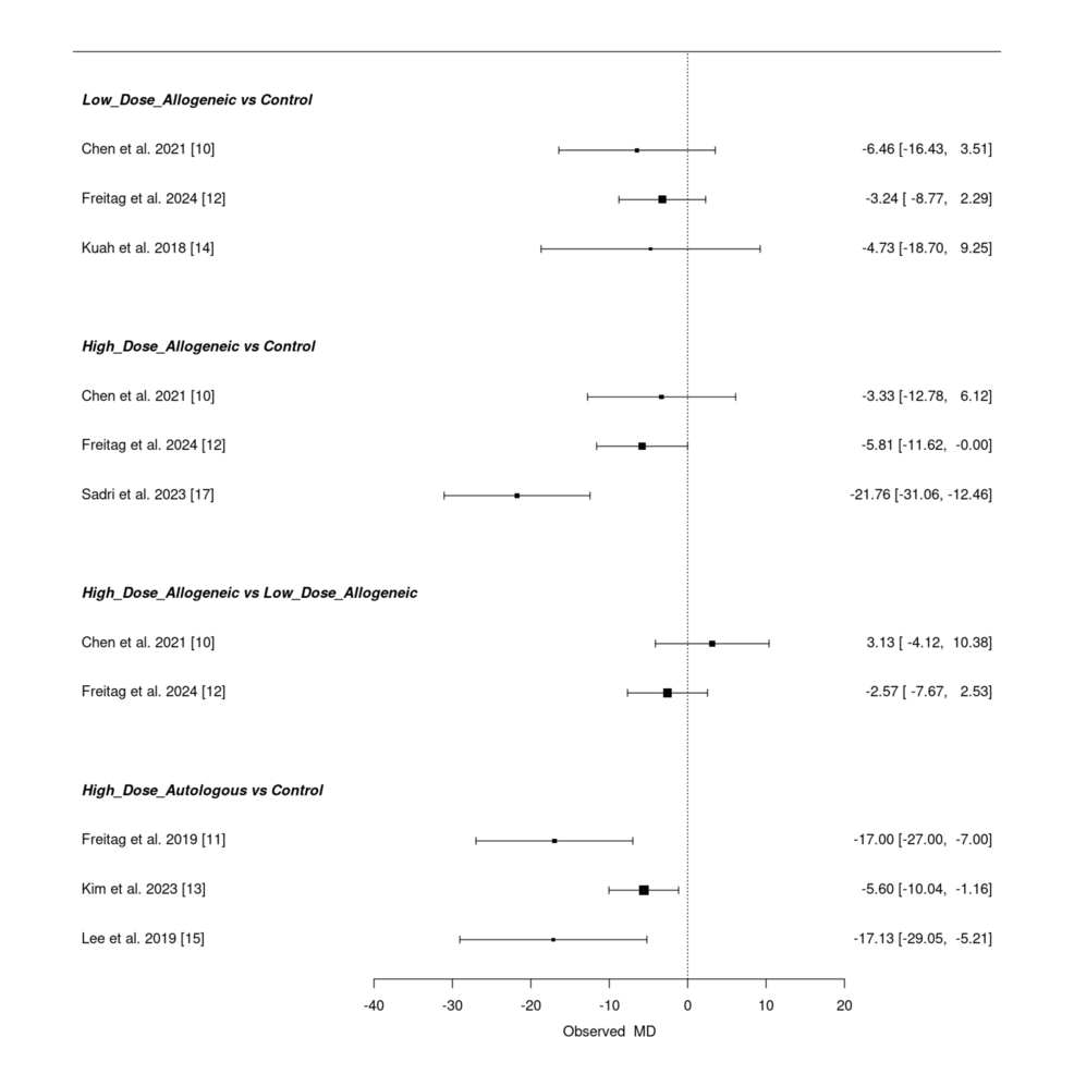 低劑量異基因AD-MSCs在Chen等(2021年)和Freitag 等(2024年)研究中僅表現出小幅改善(MD 分別為 – 6.46 和 – 3.24),Kuah 等(2018 年)因置信區間寬泛,療效不確定性突出。高劑量異基因 AD-MSCs 在 Sadri 等(2023 年)研究中實現強效改善,Freitag 等(2024 年)也觀察到顯著但較溫和的效果(MD=-5.81),但 Chen 等(2021 年)因置信區間較寬,效果存疑。高劑量自體 AD-MSCs 在 Freitag(2019 年,MD=-17.00)和 Lee(2019 年,MD=-17.13)等研究中均顯示顯著改善,即使 Kim 等(2023 年)的中等效果(MD=-5.60)仍優于低劑量組。高劑量與低劑量異基因組的直接比較因置信區間重疊,未顯示明確劑量優勢。