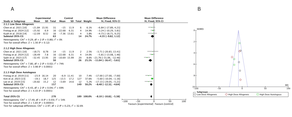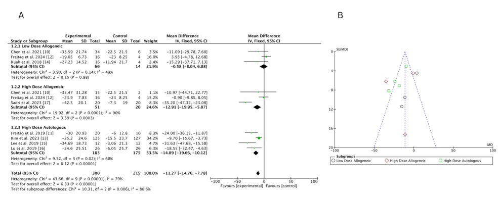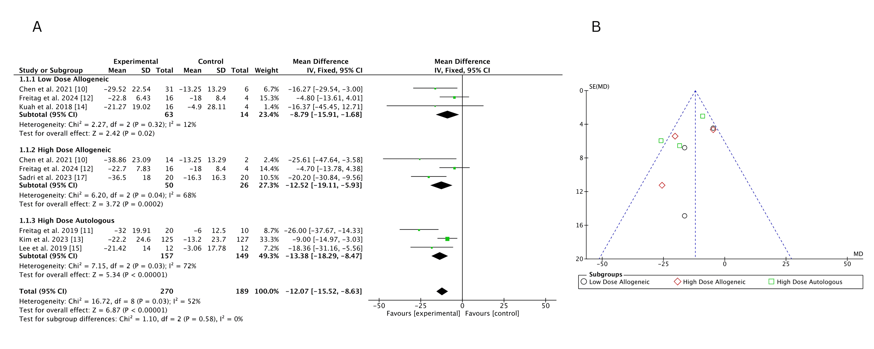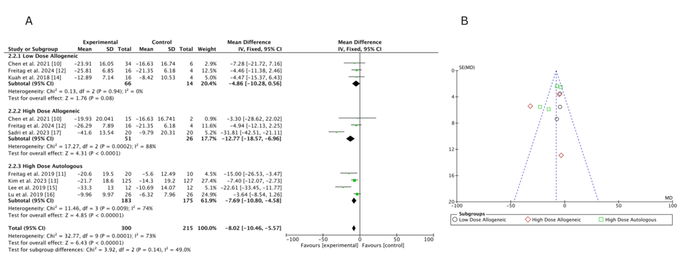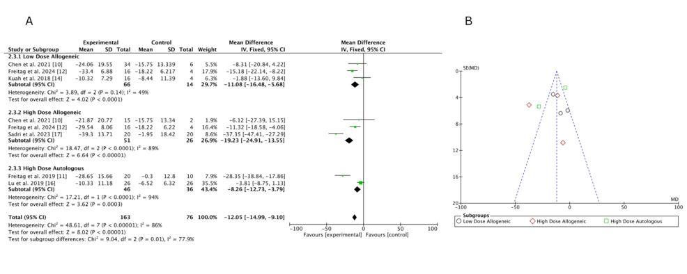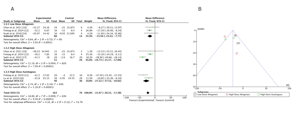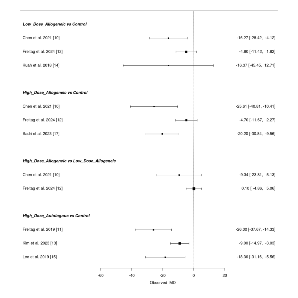 低劑量異基因AD-MSCs在Chen等(2021年)和Freitag 等(2024年)研究中僅表現出小幅改善(MD 分別為 – 6.46 和 – 3.24),Kuah 等(2018 年)因置信區間寬泛,療效不確定性突出。高劑量異基因 AD-MSCs 在 Sadri 等(2023 年)研究中實現強效改善,Freitag 等(2024 年)也觀察到顯著但較溫和的效果(MD=-5.81),但 Chen 等(2021 年)因置信區間較寬,效果存疑。高劑量自體 AD-MSCs 在 Freitag(2019 年,MD=-17.00)和 Lee(2019 年,MD=-17.13)等研究中均顯示顯著改善,即使 Kim 等(2023 年)的中等效果(MD=-5.60)仍優于低劑量組。高劑量與低劑量異基因組的直接比較因置信區間重疊,未顯示明確劑量優勢。
