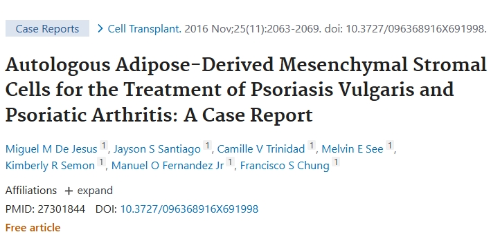 2016年,De Jesus等人在一項“自體脂肪來源的間充質基質細胞治療尋常型銀屑病和銀屑病關節炎”報告稱,兩例尋常型銀屑病患者在接受AD-MSCs治療后紅斑鱗屑得到改善,PASI-50維持了9.7個月。