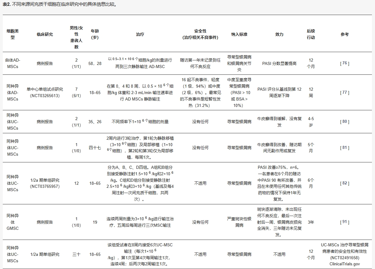 2016年,中國北京軍事醫學科學院附屬醫院造血干細胞移植科報道了兩例尋常型銀屑病患者在接受臍帶MSC治療后,PASI維持4-5年。