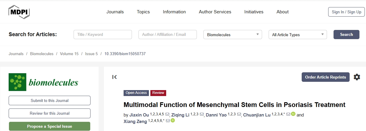 [1]Ou, J.; Li, Z.; Yao, D.; Lu, C.; Zeng, X. Multimodal Function of Mesenchymal Stem Cells in Psoriasis Treatment. Biomolecules 2025, 15, 737. https://doi.org/10.3390/biom15050737