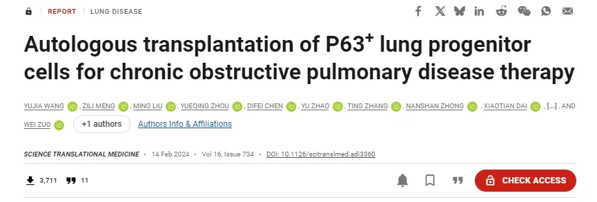 [4]Yujia Wang et al.,Autologous transplantation of P63+ lung progenitor cells for chronic obstructive pulmonary disease therapy.Sci. Transl. Med.16,eadi3360(2024).DOI:10.1126/scitranslmed.adi3360