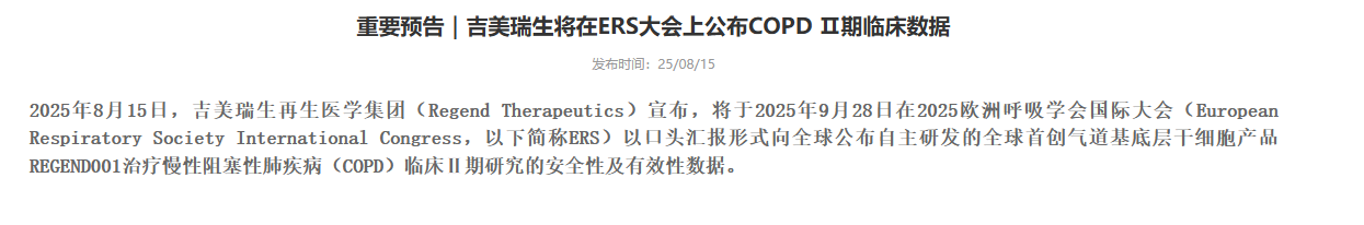 8月15日,上海瑞金落地的慢阻肺干細(xì)胞治療臨床實驗室吉美瑞生再生醫(yī)學(xué)集團(tuán)(Regend Therapeutics)正式宣布,將在2025年9月28日于荷蘭阿姆斯特丹舉辦的歐洲呼吸學(xué)會國際大會(ERS)上,以口頭匯報形式向全球披露其自主研發(fā)的全球首創(chuàng)氣道基底層干細(xì)胞產(chǎn)品REGEND001,在治療慢性阻塞性肺疾病(COPD)臨床Ⅱ期研究中的安全性與有效性核心數(shù)據(jù),為全球慢阻肺病治療領(lǐng)域帶來新的關(guān)注焦點。[9]
