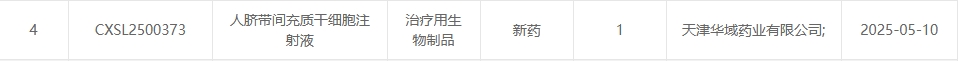 新增受理11:2025年05月10號(hào),天津華域藥業(yè)有限公司的“人臍帶間充質(zhì)干細(xì)胞注射液”的臨床試驗(yàn)申請(qǐng)獲受理(受理號(hào):CXSL2500373)。這是該款細(xì)胞注射液第1次獲得受理。
