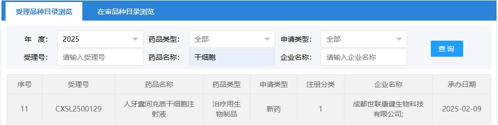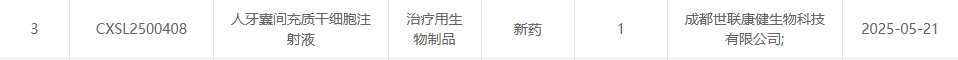 新增受理12:2025年05月21號(hào),成都世聯(lián)康健生物科技有限公司的“人牙囊間充質(zhì)干細(xì)胞注射液”的臨床試驗(yàn)申請(qǐng)獲受理(受理號(hào):CXSL2500408)。這是該款細(xì)胞注射液第1次獲得受理。