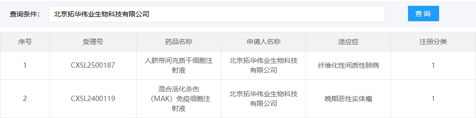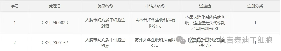 新增受理7:2025年02月28號(hào),北京拓華偉業(yè)生物科技有限公司的“人臍帶間充質(zhì)干細(xì)胞注射液”的臨床試驗(yàn)申請(qǐng)獲受理(受理號(hào):CXSL2500187)。適應(yīng)癥:纖維化性間質(zhì)性肺病。