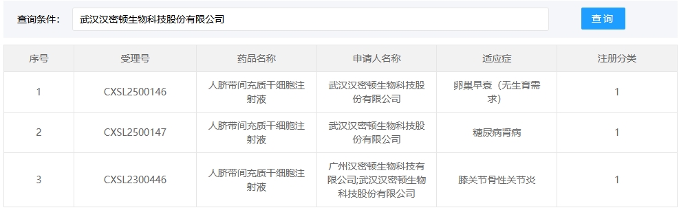 新增受理5:2025年02月15號(hào),武漢漢密頓生物科技股份有限公司的“人臍帶間充質(zhì)干細(xì)胞注射液”的臨床試驗(yàn)申請(qǐng)獲受理(受理號(hào):CXSL2500146)。適應(yīng)癥:卵巢早衰(無(wú)生育需求)。
