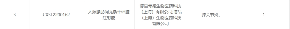 新增受理2:2025年1月25日,博品骨德(深圳)生物醫(yī)藥科技有限公司;博品(上海)生物醫(yī)藥科技有限公司的“人源脂肪間充質(zhì)干細(xì)胞注射液”的臨床試驗(yàn)申請(qǐng)獲受理(受理號(hào):CXSL2200162),這是該款細(xì)胞注射液第1次獲得受理,適應(yīng)癥:膝關(guān)節(jié)炎。