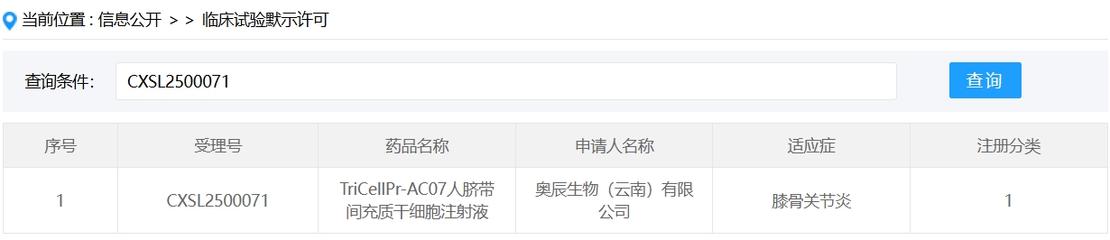 新增受理1:2025年1月23日,奧辰生物(云南)有限公司申報(bào)的 “TriCellPr-AC07人臍帶間充質(zhì)干細(xì)胞注射液” 臨床試驗(yàn)申請(qǐng)首次獲受理(受理號(hào):CXSL2500071),適應(yīng)癥:膝骨關(guān)節(jié)炎。