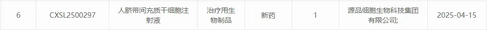新增受理9:2025年04月15號(hào),源品細(xì)胞生物科技集團(tuán)有限公司的“人臍帶間充質(zhì)干細(xì)胞注射液”的臨床試驗(yàn)申請(qǐng)獲受理(受理號(hào):CXSL2500297)。這是該款細(xì)胞注射液第1次獲得受理。