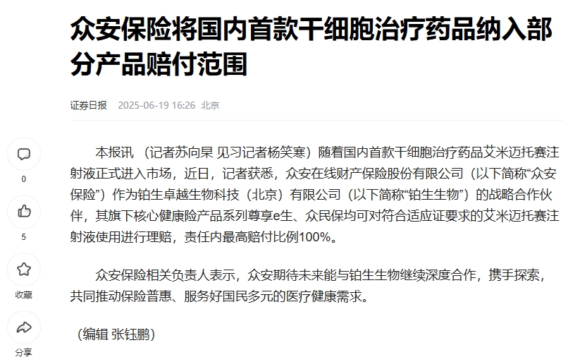 好消息!眾安保險將國內首款干細胞治療藥品納入賠付范圍