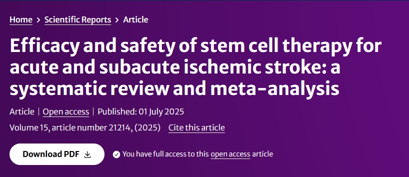 2025年。7月2號,國際權(quán)威期刊雜志《Nature》子刊“scientific reports”發(fā)表了一篇“干細胞治療急性和亞急性缺血性中風的療效和安全性:系統(tǒng)評價和薈萃分析”系統(tǒng)性綜述。