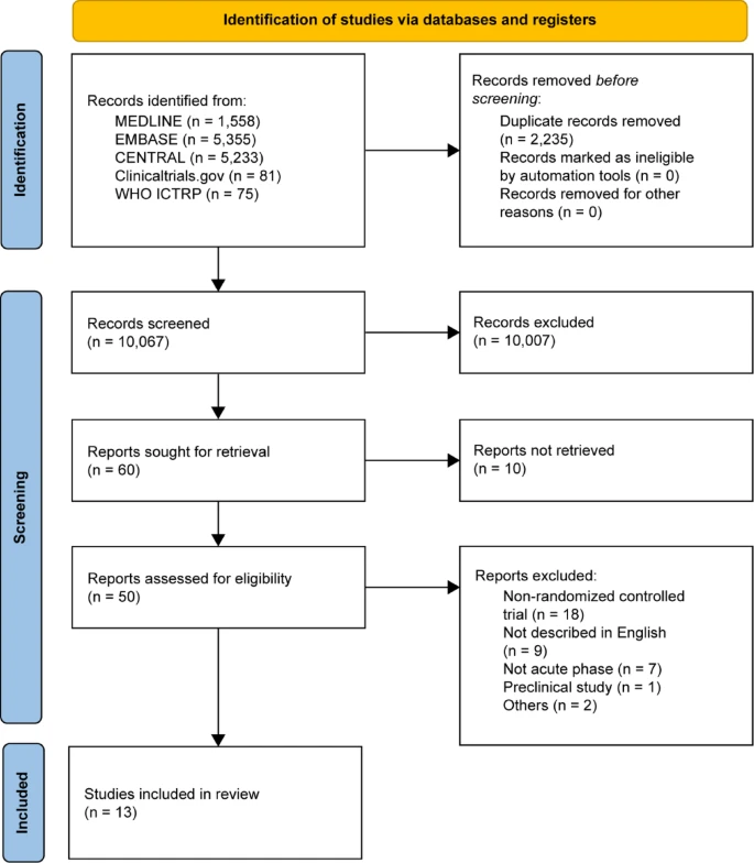 通過系統(tǒng)檢索共篩選10,067篇文獻(流程圖見圖1),初步納入60項研究進行全文評估。經(jīng)嚴格審查后排除:9項非英/日語報告、18項非RCT研究、7項未納入急性/亞急性缺血性卒中患者的研究、2項因其他原因不符及1項臨床前研究。最終,13項RCT符合納入標準,共涉及872例患者(男性519例,女性353例),構(gòu)成了本次薈萃分析的核心證據(jù)庫。