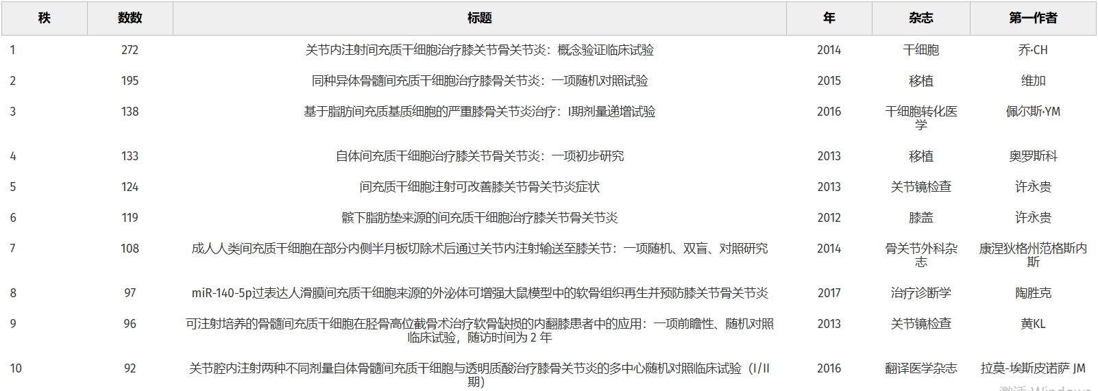 此外,文獻計量結果顯示,《骨關節炎與骨關節炎》(Osteoarthritis and Cartage)、《關節炎研究與治療》(Arthritis Research and Therapy)、《美國運動醫學雜志》(American Journal of Sports Medicine)、《干細胞》(Stem Cells)以及《風濕病年鑒》(Annals of Rheumatic Diseases)的引用率較高,表明這些期刊發表的該領域成果具有較高的學術價值。