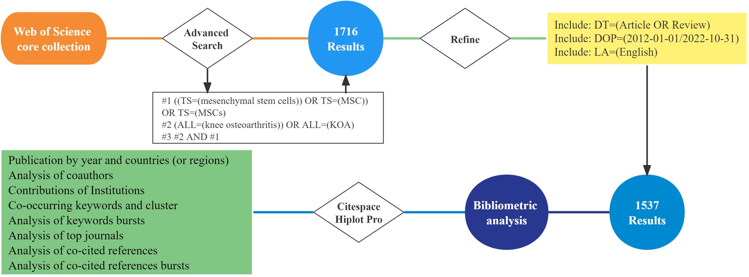 文獻來源與檢索策略:本研究數據來源于Web of Science核心合集數據庫(WOSCC)。檢索限定于2012年1月1日至2022年10月31日期間發表、類型為文章或綜述、語言為英文、主題涉及間充質干細胞(MSCs)在膝骨關節炎(KOA)中研究與應用的文獻。具體檢索式為:TS=([MSCs OR MSCs OR MSCs]AND[knee bone arthritis OR KOA]),初步獲得1716篇相關文獻。