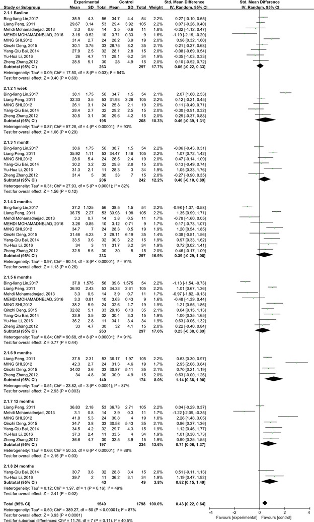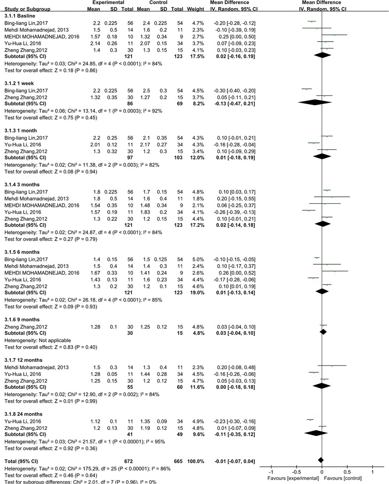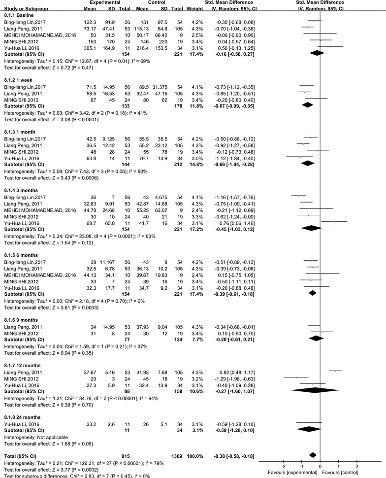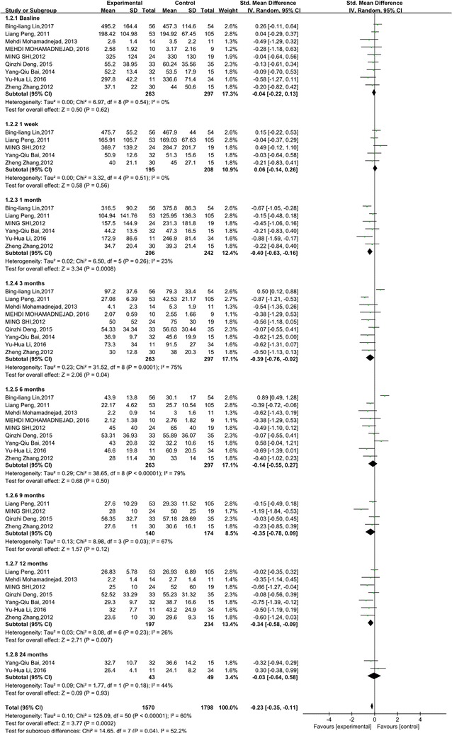 與對照組相比,干細胞治療后ALT水平顯著降低(p<0.00001)(圖5)。亞組分析顯示,干細胞治療組ALT水平也有所降低,在1周、1個月和6個月時間點均低于基線和相應對照組。干細胞治療后9、12和24個月時ALT水平無顯著差異。關于1周、6和9個月時的ALT水平,未發現異質性。但是,應考慮1、3和12個月時 ALT水平的異質性。但這只能通過一兩項研究來解釋。