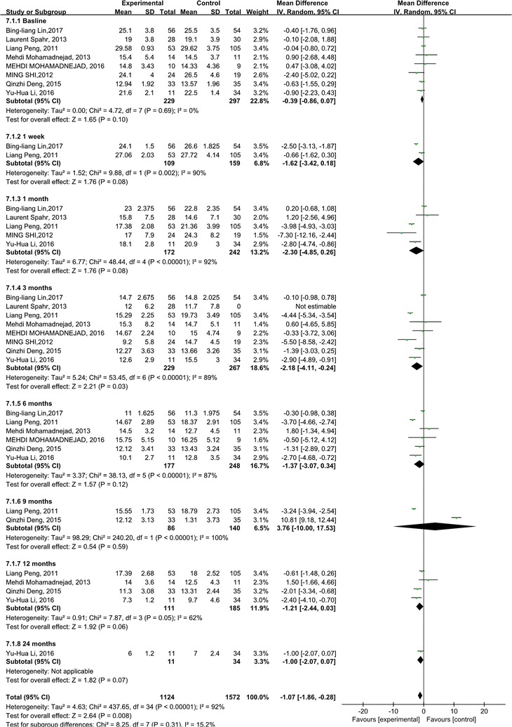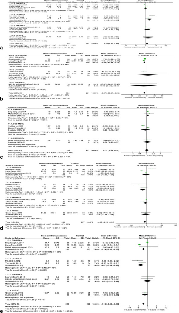 MELD評分主要用于評估終末期肝病的預后。我們觀察到干細胞治療組和對照組的MELD評分均有所下降。干細胞治療組和對照組之間存在顯著差異 (p =0.008)(圖6)。此外,盡管進行了亞組分析,但這些研究的異質性很高 (I 2 : 62–100%)。但這也可以僅通過一兩項研究來解釋。
