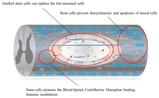 將細(xì)胞移植到受傷的脊髓中是治療慢性SCI的明顯策略,用于重新填充內(nèi)源性再生過程未補(bǔ)充的細(xì)胞。先前的報(bào)告顯示,移植細(xì)胞不僅通過重新填充細(xì)胞起作用,而且還通過將移植部位調(diào)節(jié)到更適宜的環(huán)境中,從而防止神經(jīng)細(xì)胞脫髓鞘和凋亡(圖2和圖3)。