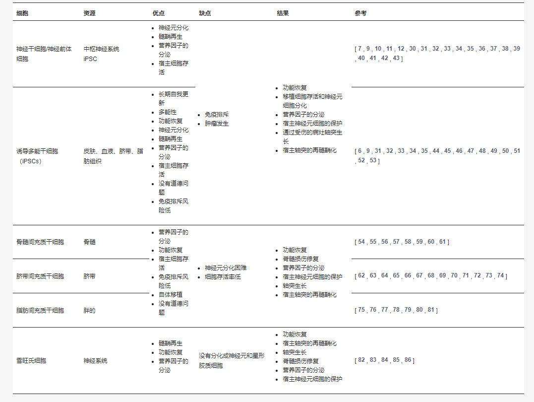 NSCs、間充質(zhì)干細(xì)胞 (MSCs) 和從包括iPSC在內(nèi)的各種組織收獲的雪旺細(xì)胞的移植被報(bào)道為慢性 SCI 的細(xì)胞療法。