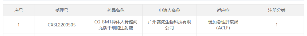 今日,據(jù)國家藥品監(jiān)督管理局藥品審評(píng)中心(CDE)官網(wǎng)公布,廣州賽雋生物科技有限公司(以下簡稱“賽雋生物”)“CG-BM1異體人骨髓間充質(zhì)干細(xì)胞注射液”新適應(yīng)癥IND申請獲得臨床默示許可(受理號(hào):CXSL2200505)。獲批適應(yīng)癥為:慢加急性肝衰竭(ACLF)。
