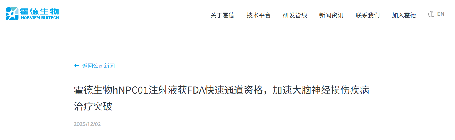 2025年12月2日,我國霍德生物宣布,公司自主研發的國際首款人前腦神經前體細胞注射液(hNPC01)獲得了美國食品藥品監督管理局(FDA)授予的快速通道資格(Fast Track Designation, FTD),用于治療缺血性腦卒中導致的長期運動功能障礙。[5]