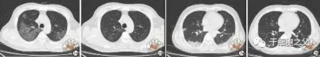 如圖所示,1a-1b:細(xì)胞輸注后,炎癥指標(biāo)改善,復(fù)查胸部CT提示雙肺病灶較前吸收,呼吸道癥狀改善,新型冠狀病毒核酸檢測(cè)連續(xù)2次陰性,治愈出院。圖2a-2b:2次干細(xì)胞輸注后炎癥指標(biāo)改善,復(fù)查時(shí)氧合指數(shù)升高至301 mmHg,胸部CT提示雙肺病灶較前吸收,患者呼吸道癥狀改善,新型冠狀病毒核酸檢測(cè)連續(xù)2次陰性,治愈出院。