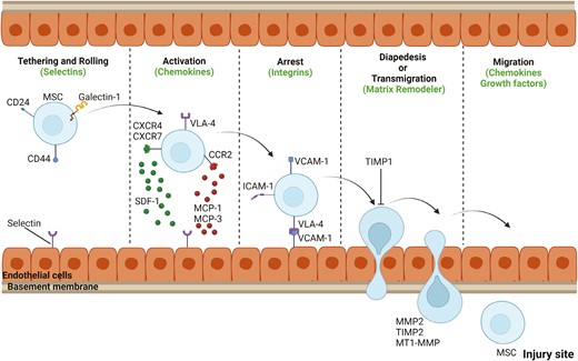 間充質(zhì)干細(xì)胞的系統(tǒng)性歸巢包括五個不同的步驟,包括黏附和滾動、激活、細(xì)胞停滯、滲出或跨內(nèi)皮遷移以及遷移。