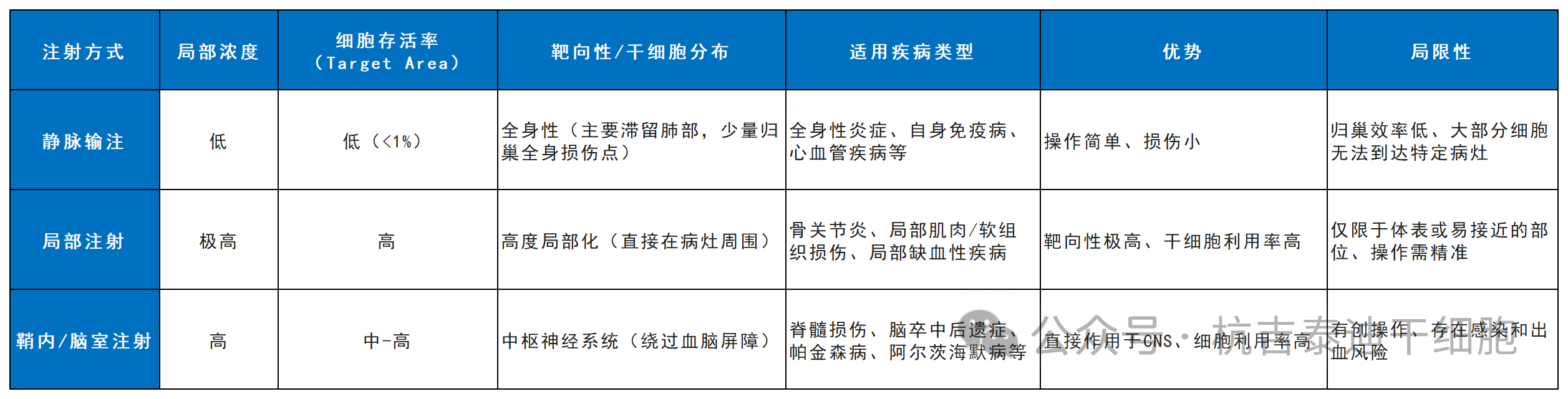 是的,注射方式是療效的“戰(zhàn)略決策”。它直接決定了干細(xì)胞的初始分布、存活率和作用模式(表1)。
