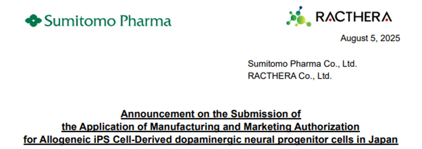 2025年8月,日本住友制藥(Sumitomo Pharma)與 Racthera 聯合宣布,已向監管機構提交同種異體iPS細胞衍生多巴胺能神經祖細胞(通用名:raguneprocel)的生產與上市許可申請,用于改善中晚期帕金森病患者「關期」運動功能。