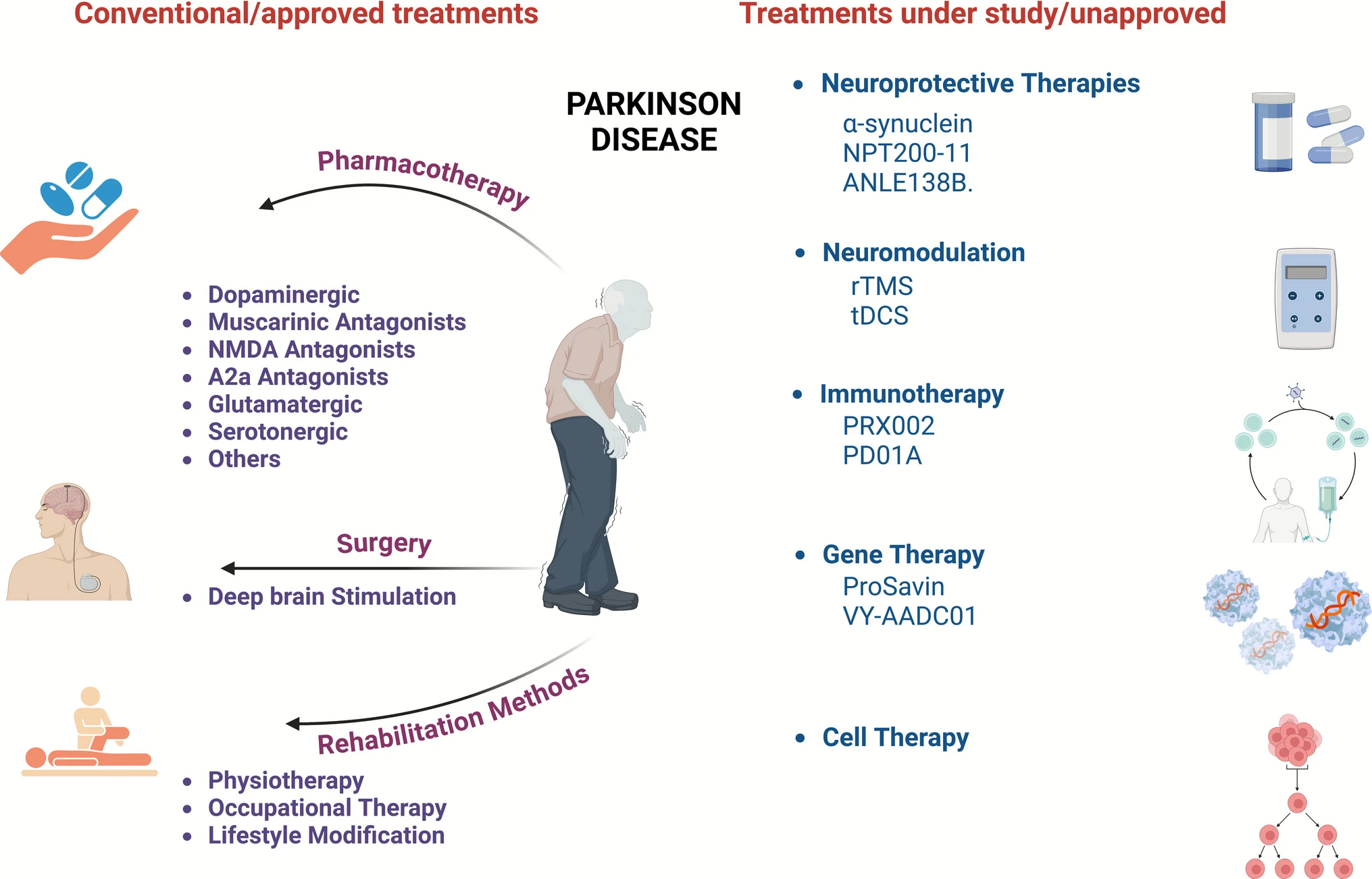 盡管現(xiàn)代醫(yī)學(xué)通過藥物(如左旋多巴)和手術(shù)(如深部腦刺激)手段能夠有效控制部分運動癥狀,但所有現(xiàn)有療法均屬于對癥治療,無法從根本上延緩或阻止黑質(zhì)多巴胺能神經(jīng)元的退化進(jìn)程,這構(gòu)成了當(dāng)前臨床治療的主要局限(圖1)。