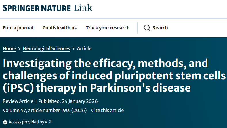 [1]:Mustafa, M.A., Al-Hasnaawei, S., Kaur, I. et al. Investigating the efficacy, methods, and challenges of induced pluripotent stem cells (iPSC) therapy in Parkinson’s disease. Neurol Sci 47, 190 (2026). https://doi.org/10.1007/s10072-025-08719-1
