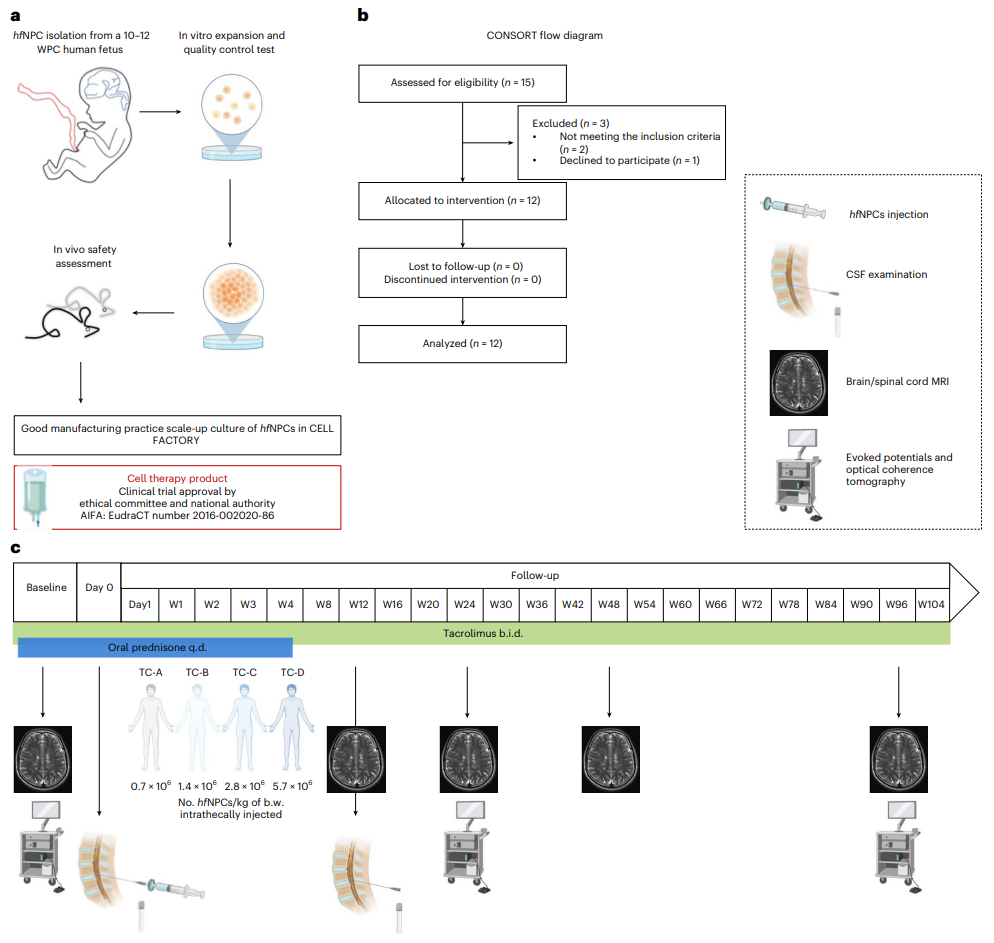 2023年1月9日,意大利IRCCS San Raffaele科學(xué)研究所等機(jī)構(gòu)的研究人員在國際頂尖醫(yī)學(xué)期刊Nature Medicine 上發(fā)表了題為:Neural stem cell transplantation in patients with progressive multiple sclerosis: an open-label, phase 1 study 的研究論文。